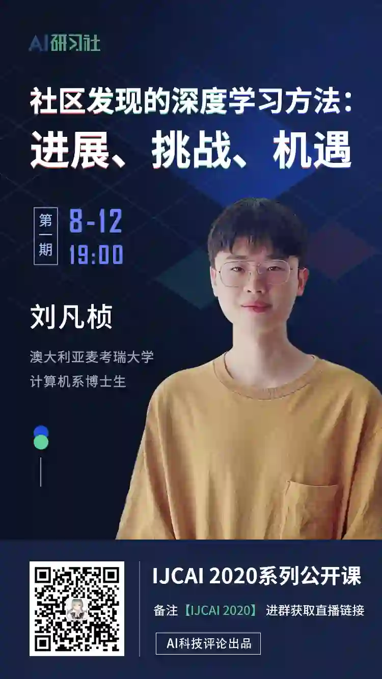 今年已过半,AI 科技评论携手各大高校、企业研究机构为大家带来了100多场顶会论文直播,包括 AAAI、ICLR、ICML、CVPR、ACL、KDD、ECCV 等一系列 AI 学术顶会。如今,我们又将迎来 IJCAI 2020 的首场论文直播!本场直播的主题是:“社区发现的深度学习方法:进展、挑战、机遇”。论文由数据挖掘领域大牛 Philip S. Yu 携手悉尼麦考瑞大学、澳大利亚联邦科学与工业研究组织Data61部门、中国科学院、武汉大学的研究者共同完成。论文地址:https://www.ijcai.org/Proceedings/2020/693社区发现(Community Detection),简单来说就是从网络 G 中发现社区集合 C。该网络指的是一种特殊的图,对现实世界中的系统(例如,互联网、学术合作网络以及社交群组)中的复杂关系进行了抽象。社区发现作为网络科学领域中一个经久不衰的重要问题,随着深度学习时代的到来,该领域的研究者也逐渐从传统的统计推断(例如,随机分块模型)和传统机器学习(例如,谱聚类)方法中解放了出来。深度学习因其处理高维图数据的强大能力,能极大地提升了社区发现的性能。近五年来,用于社区发现的深度学习方法,被广泛地研究。那么,深度学习时代的社区发现工作有哪些特点,研究者们遇到了哪些挑战,有哪些前景光明的研究方向呢?Philip S. Yu 团队在这篇论文中,不仅全方位地回顾了模型和算法研发方面相应的技术趋势,并详细阐述了基于深度学习领域的社区发现进展,还指出了将深度学习用于社区发现任务时存在的七个重大挑战——这在一定程度上将为下一代社区发现研究指明方向。对于社区发现领域的研究者而言,这篇顶会综述文章非常值得一读。8月12日晚19点,AI 科技评论特意邀请到了论文一作——悉尼麦考瑞大学的博士研究生刘凡桢带来首场 IJCAI 系列直播,对这篇文章进行深度解读!另外,跟数据挖掘领域大牛 Philip S. Yu合作又是一种什么体验呢?刘凡桢也能跟大家分享分享在跟 Philip S. Yu 合作的经历和故事哦~机会不容错过! 分享主题:社区发现的深度学习方法:进展、挑战、机遇分享嘉宾:刘凡桢,悉尼麦考瑞大学博士研究生。分享时间:2020年8月12日晚19:00(悉尼时间晚21:00)