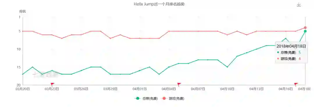 近一个月来,《Helix Jump》在免费游戏排行榜中一直在前十,4月5日新版本发布后,一直居于榜单前五。