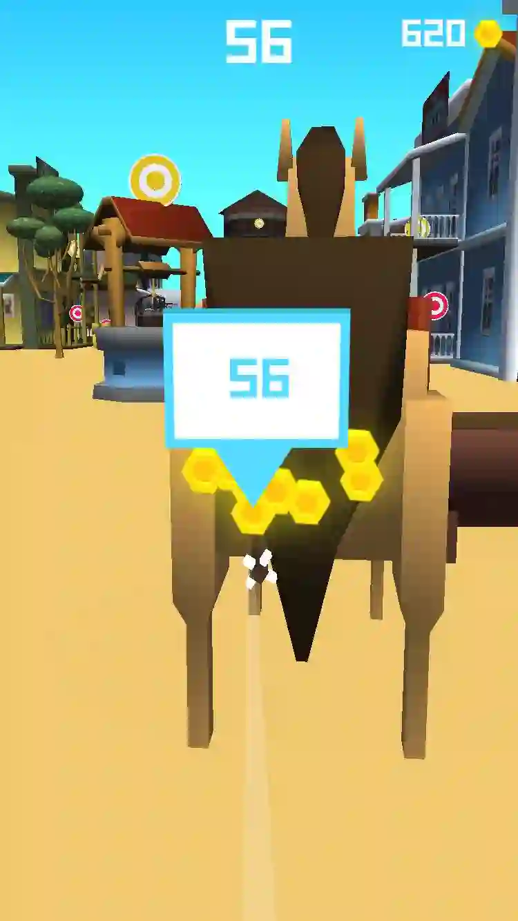 1、玩家需要在屏幕上控制弓箭前进,进入不同的场景中。玩家需要射中靶子,离靶心越近分数越高。
