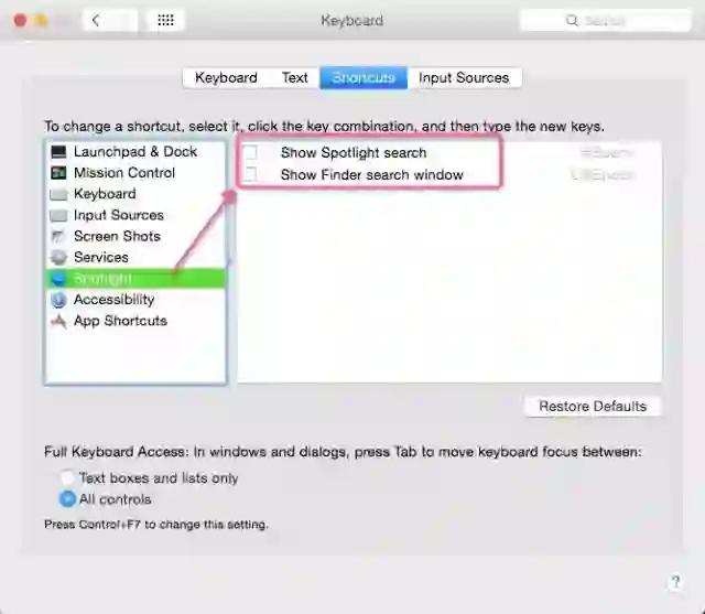 打开System Preferences,选择Keyboard,切换到Shortcuts这个Tab下,点击Spotlight,取消对应的2个快捷键设置。