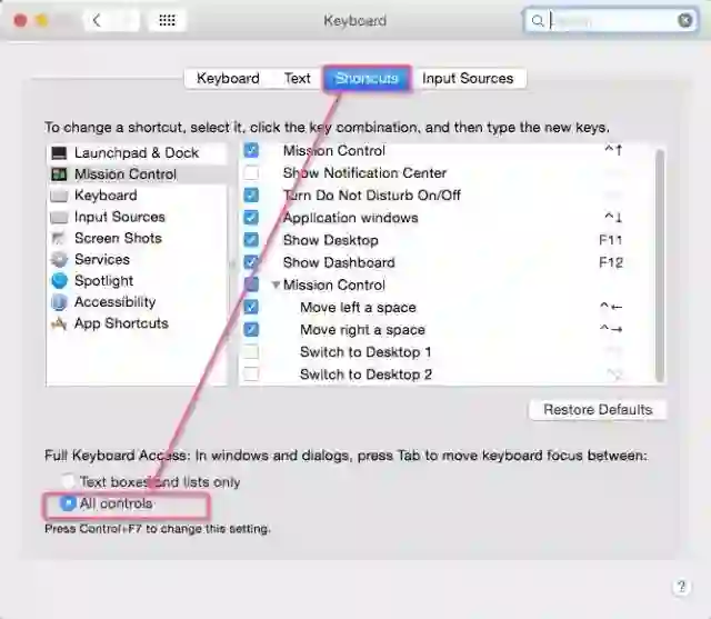 如图,首先打开System Preferences,点击Keyboard图标,选择Shortcuts这个Tab, 选中All controls