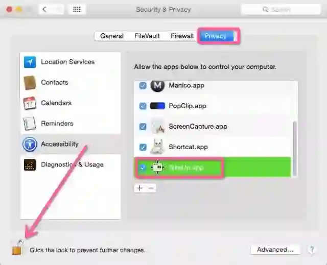 直接点击Open System Preferences或者打开System Preferences,点击Security & Privacy图标,在PrivacyTab内,点击Accessibility,然后将SizeUp加到右边的列表里面。(提示:你可能需要先点击右下角的黄色锁,输入密码后才能编辑右边的列表。)