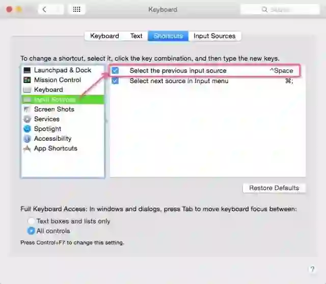 系统自带的输入法不是很好用,推荐安装搜狗输入法或者RIME输入法。安装完成后,打开System Preferences,选择Keyboard,切换到Shortcuts这个Tab下,勾选Select the previous input source,并点击上述文字后面的空白处,设置快捷键为Ctrl+Space(即如图所示的^Space)。