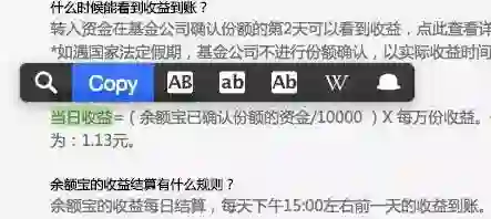 这些重复的操作模式都是可以简化的,你唯一需要的就是PopClip,当你选中一段文字(如下图,选中“当日收益”),PopClip就会弹出来一个快捷操作栏,你可以复制,剪切或者粘贴,更为强大的是,PopClip提供了很多免费的插件,例如使用指定的搜索引擎搜索选中的文字,或者选中英文单词做大小写转换等等。