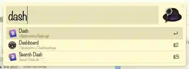 现在按下快捷键command + 空格,输入dash,则Alfred不区分大小写的将所有包含dash的应用程序,文档以及历史网址都列出来了,如下图所示,回车打开Dash,command+2打开本Dashboard,你还可以移动键盘上下键或者光标来选择目标。