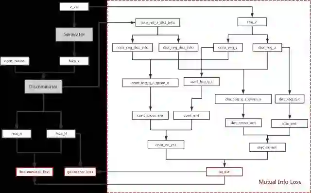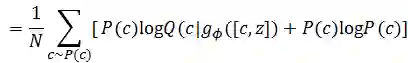 其中c表示与图像有相关关系的隐变量,z表示与图像无关的隐变量。于是互信息计算公式就变成了: