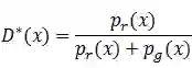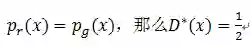 这就是理论上判别式的预测结果,如果一张图像在真实分布中出现的概率大而在生成分布中出现的概率小,那么最优的判别模型会认为它是真实图像,反之则认为不是真实图像。如果生成模型已经达到了完美的状态,也就是说对每一幅图像都有: