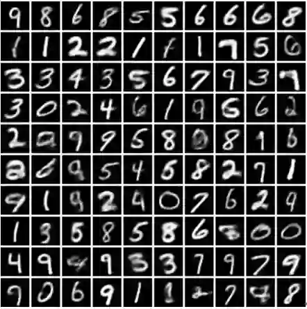 经过上面对VAE理论和实验的介绍,相信读者对VAE模型有了更清晰的认识。经过训练后VAE的解码器在MNIST数据库上生成的字符如图10-2所示。