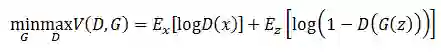 由于组成式子的两部分积分的区域不同,会对后面的计算造成困难,我们首先将两个积分区域统一。我们将生成图像G(z)的分布与真实图像x的分布做一个投射,只要判别式能够在真实数据出现的地方保证判别正确最大化即可,于是公式就变成了: