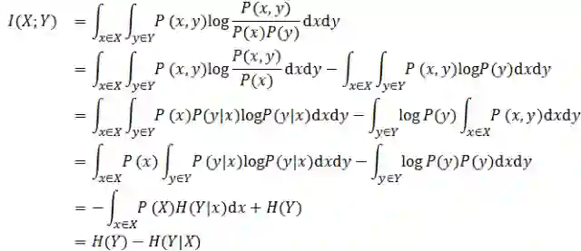 就可以发现互信息的进一步解释:它可以变为熵和条件熵的差。同样地,这个公式还可以转变为:I(X;Y)=H(X)-H(X|Y)