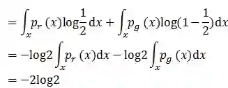 接下来就可以利用上面的结果,计算当生成模型达到完美状态时,损失函数的值。我们将D*(x)=1/2的结果代入,可以得到: