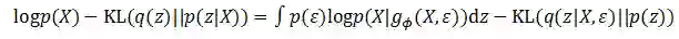 首先看等号左边,虽然p(X)的概率分布不容易求出,但在训练过程中当X已经给定,p(X)已经是个固定值不需要考虑。如果训练的目标是希望KL(q(z)||p(z|X))尽可能小,就相当于让等号右边的那部分尽可能变大。等号右边的第一项实际上是基于q(z)概率的对数似然期望,第二项又是一个负的KL散度,所以我们可以认为,为了找到一个好的q(z),使得它和p(z|X)尽可能相近,实现最终的优化目标,优化的目标将变为: