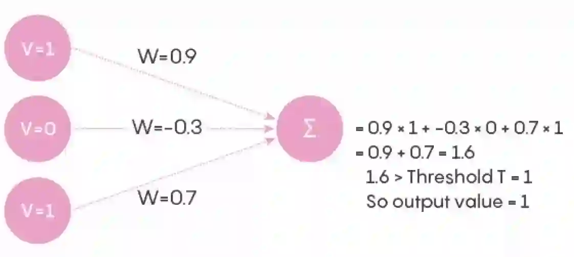 可以看到,图中一共有 21 个连接。输入层的每个单元在给定的时间点上,都处于关闭或打开的状态,其值为 0 或 1。从输入层到输出层的每个连接都有一个相关权重,在人工神经网络中,这个数字是 0 到 1 之间的实数。为了使网络更类似于一个实际的神经网络,我们将权重设置为–1 到 1 之间的实数(负号表示抑制神经元)。输入的值和连接权重的乘积传送到输出神经元,如下图所示。输出神经元将它从所有连接处得到的数字相加,获得一个单个的数字。例如下图中,使用任意的输入值和连接权重输入到单个输出神经元。基于这个数字,输出神经元决定它的状态是什么。如果数字超过一定阈值,则单元的值为 1,否则为 0。我们称值为 1 的单元为“开”或“激活”单元,值为 0 的单元为“休眠”单元。