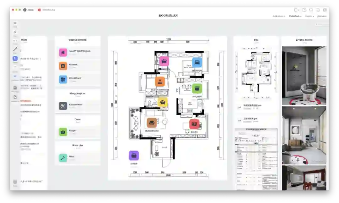 Milanote 是一个自由度非常高的剪贴板,基本上我所有和装修相关的信息都放在里面,从我相中的家具店地址,到平面图、设计渲染图、购买清单甚至相关的合同文档都整理了进去。