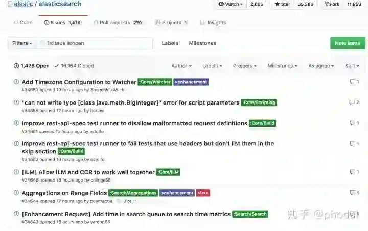 开源世界有一个通用的基本规则:遇到 bug 的时候,你才会想起这个项目还有作者。ElasticSearch 有 1476 个 issues,了解一下。相比之下,它有 35k 的 star。