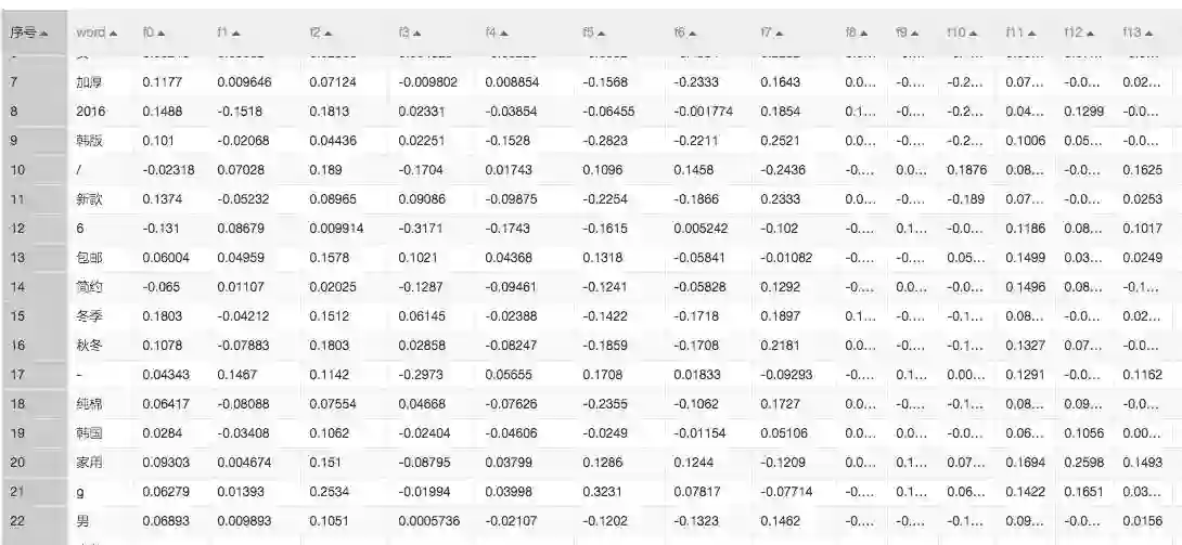 向量距离近的两个词他们的真实含义会比较相近,比如在我们的数据中,“新加坡”和“日本”都表示产品的产地,那么这两个词的向量距离会比较近。