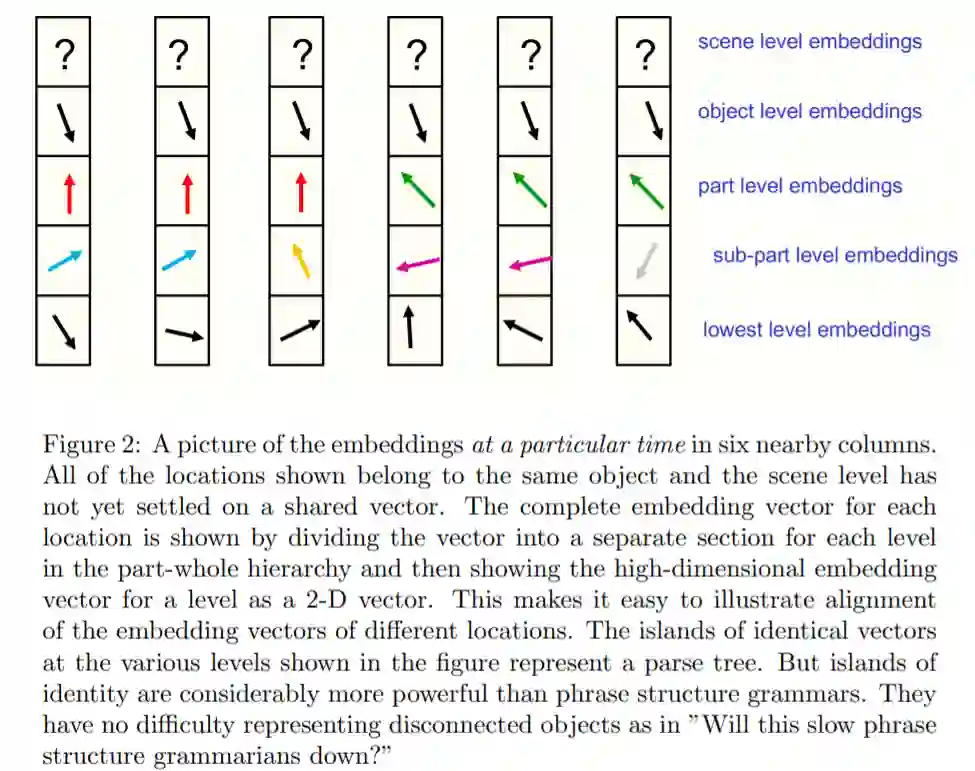 解析树中的节点由相似向量的 island 表示,这一观点统一了两种非常不同的理解感知的方法。第一种方法是经典的格式塔学派,主张人脑的运作原理属于整体论,整体不同于其部件的总和,还提出了「场(field)」的理论来建模感知。在 GLOM 中,一个 percept 就是一个场,表示整体的共享嵌入向量实际上与表示部分的共享嵌入向量非常不同。第二种方法是经典的人工智能派别,它依靠结构描述来建立感知模型。GLOM 也有结构描述,解析树中的每个节点都有自己的「地址(address)」,但地址位于可能嵌入的连续空间中,而不是硬件位置的离散空间中。