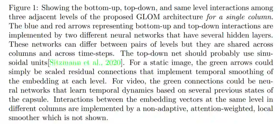 GLOM 架构是由大量使用相同权重的列组成的。每一列都是空间局部自编码器的堆栈,这些编码器学习在一个小图像 patch 中出现的多级表示。每个自动编码器使用多层自底向上编码器和多层自顶向下解码器将某一层级上的嵌入转换为相邻层级上的嵌入。这些层级与部分 - 整体层次结构中的层级相对应。例如,当显示一张脸的图像时,单个列可能会收敛到表示鼻孔、鼻子、脸和人的嵌入向量上。图 1 显示了不同层级的嵌入如何在单个列中交互。
