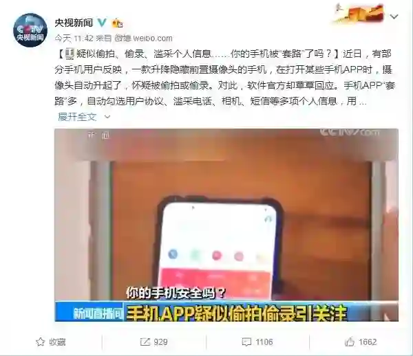7月7日,据央视新闻报道,有用户反应,vivo NEX手机在打开浏览器时前置摄像头自动升起。