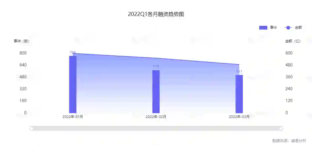 通过对比2022年Q1各月的投融资数据,总体呈现下降趋势,第一季度平均融资事件为617起,同比下降39.39%;Q1平均投融资金额保持在547万,同比下降38.53%。