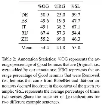 这些统计数据使团队得出一个简单但重要的结论:只有在有限的情况下,属于给定同义词集的词汇化才能被认为是所提供的目标词及其上下文的合适翻译等价物。