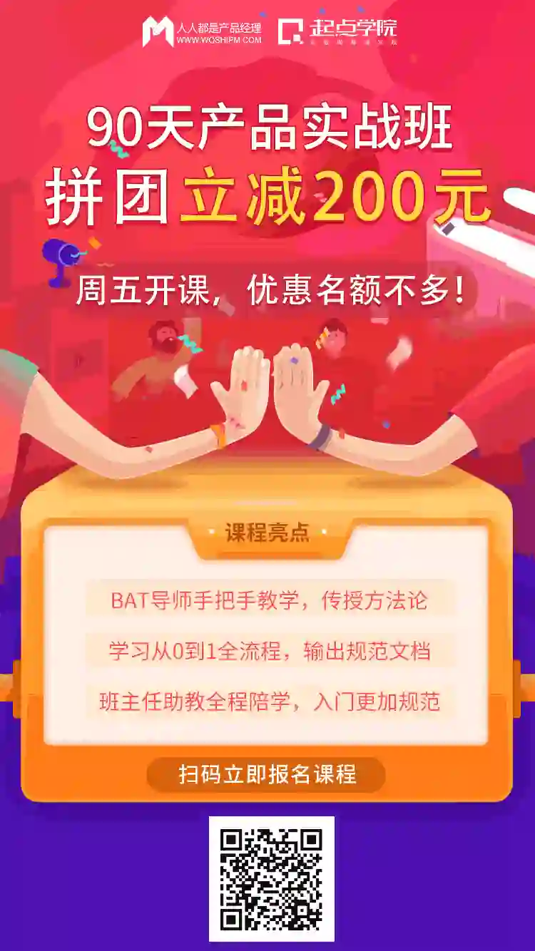 在这里,向大家推荐起点学院联合腾讯课堂创办的产品入门课程「90天产品经理实战班」。一线大厂导师可以帮助你系统输入产品知识核心板块,实践产品从0到1全流程,掌握规范文档输出能力,达到产品岗位用人要求!