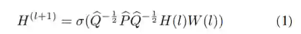 其中,P是一个n×n邻接矩阵,n表示节点的数量, ,其中 I 是单位阵, 的 diagonal node degree 矩阵,H(l) 表示顶点特征矩阵,其作为第l层网络的输入。