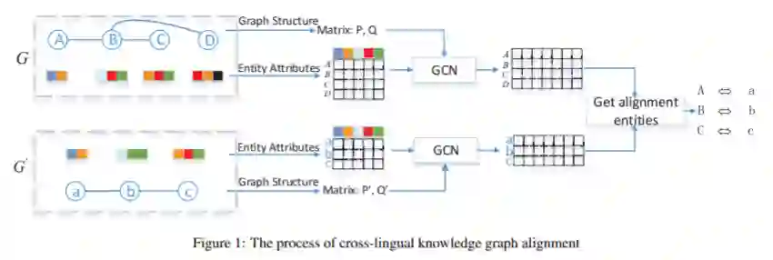 基于上述分析,作者提出利用GCN的聚合能力将属性embedding加入跨语言知识图谱对齐中。
