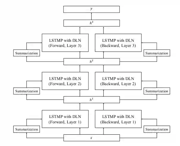 LN运用在输入-隐含神经元以及隐含神经元-隐含神经元之间,Wp就是projection layer的权重,用来对LSTM的隐含神经元进行映射。同时为了使得音频特征能够联系到上下文信息,作者使用了双向的LSTMP网络,整个网络结构如下图所示: