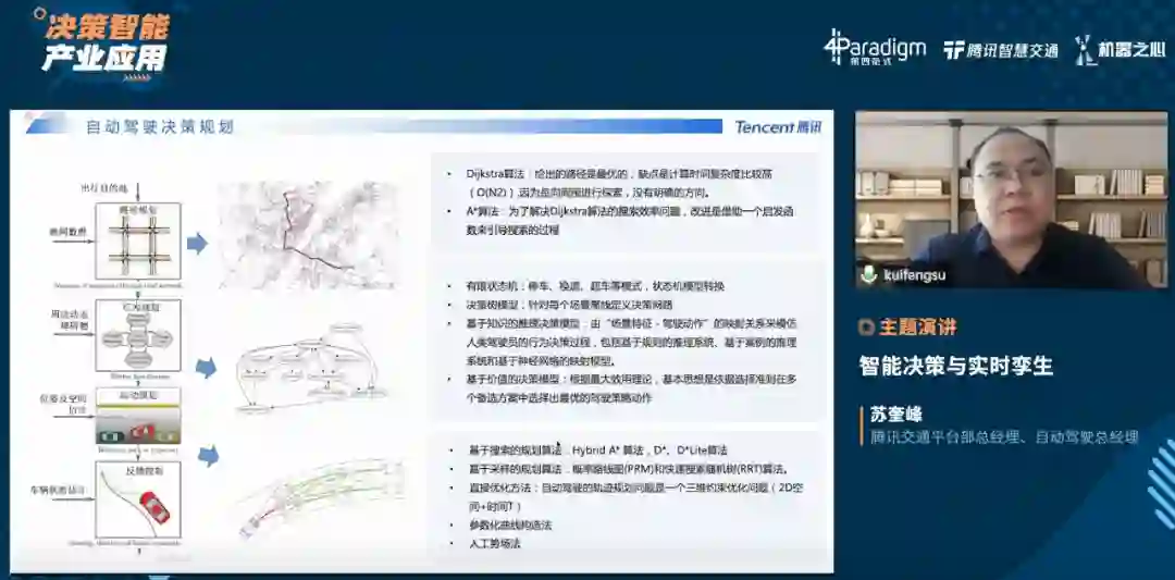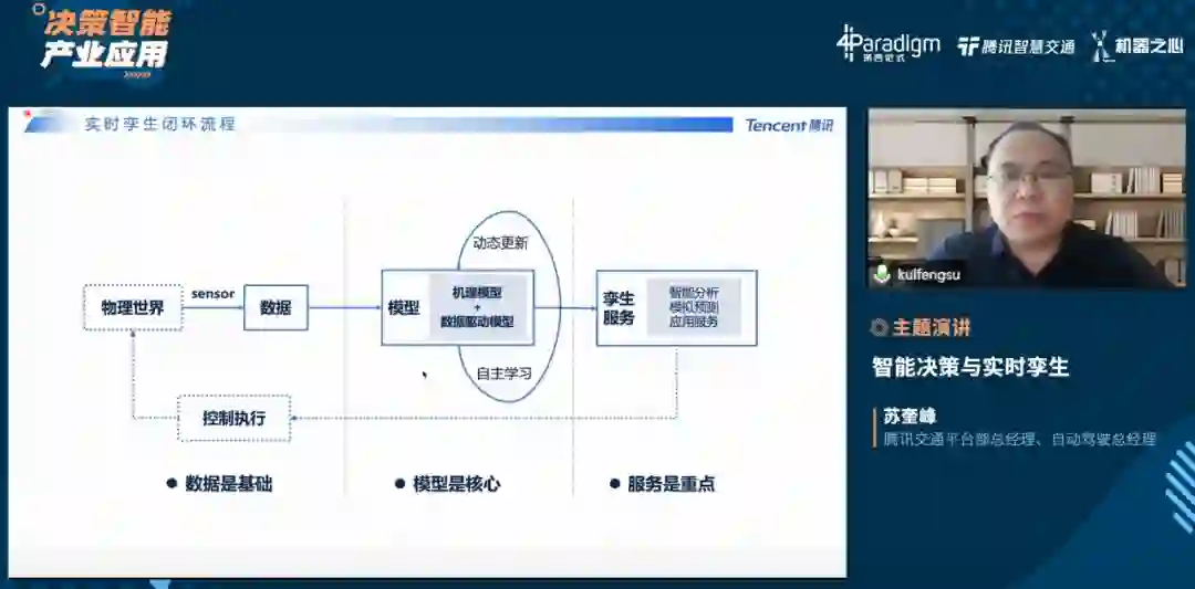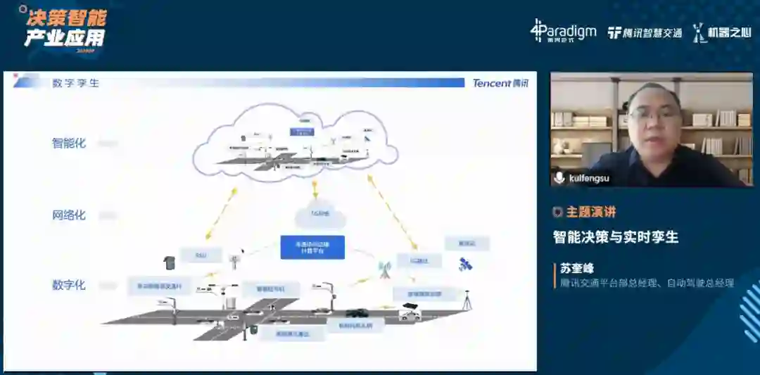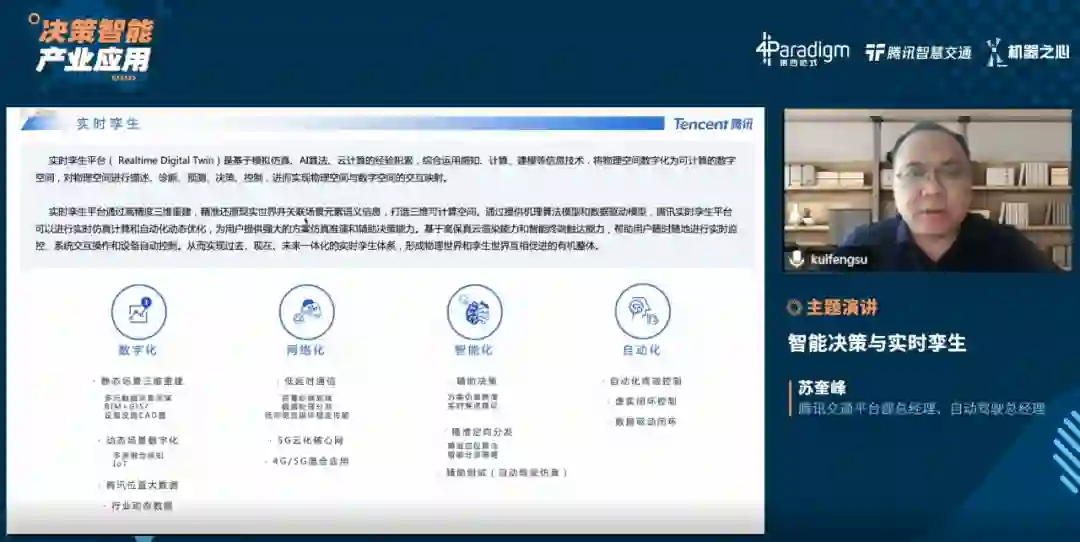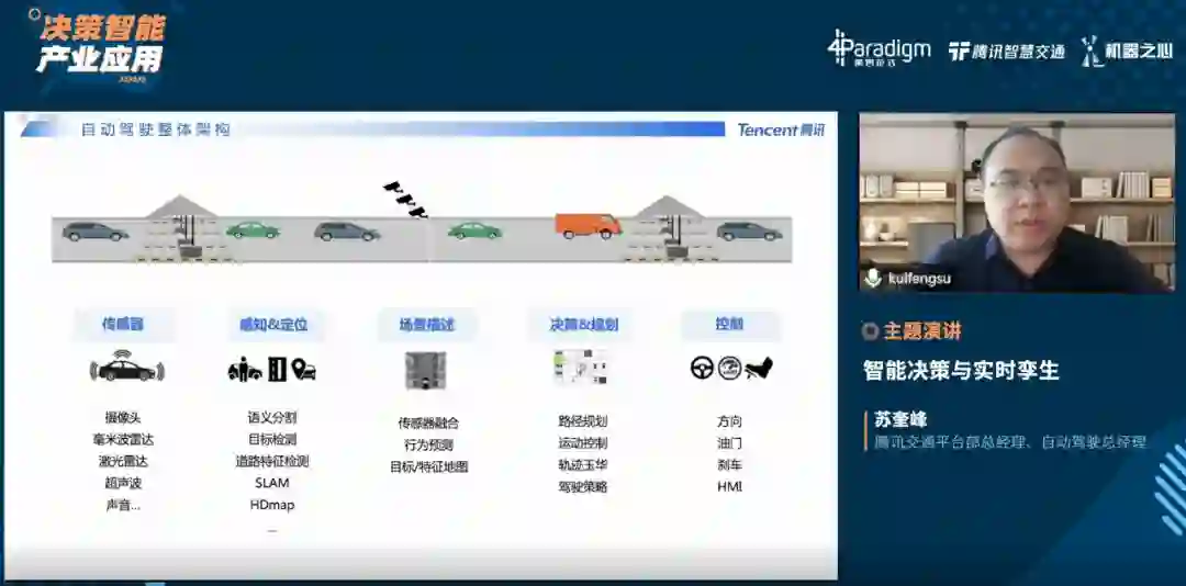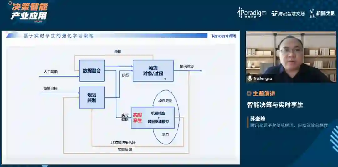 5 月 24 日,在机器之心举办的「决策智能产业应用」在线圆桌论坛上,腾讯交通平台部总经理、腾讯自动驾驶总经理苏奎峰发表了主题演讲《实时孪生与智能决策》。