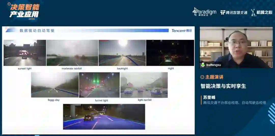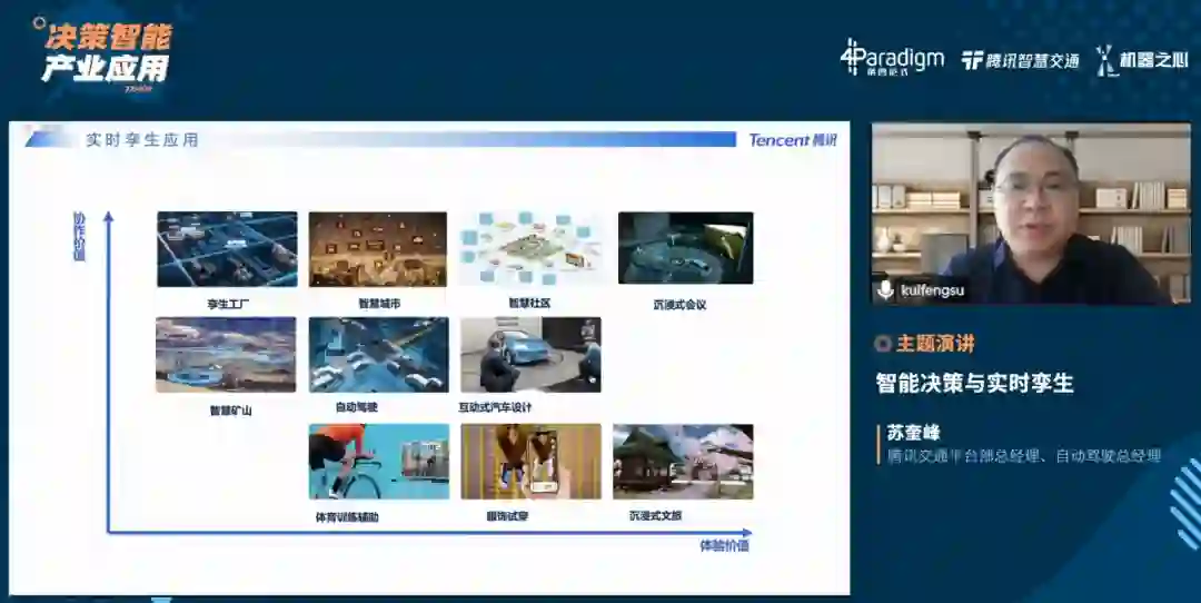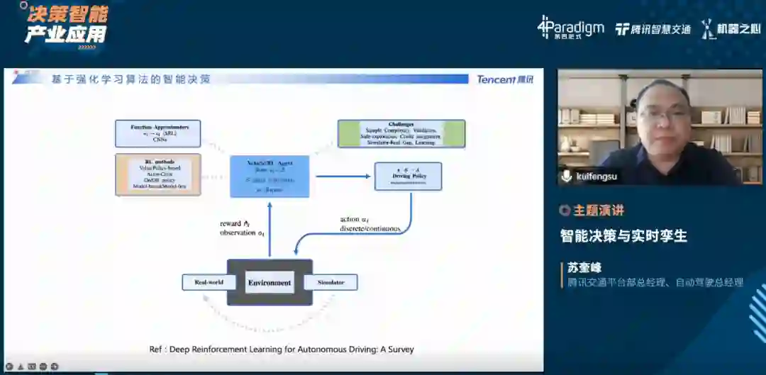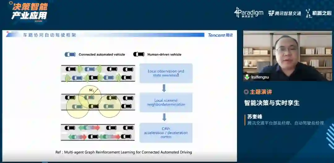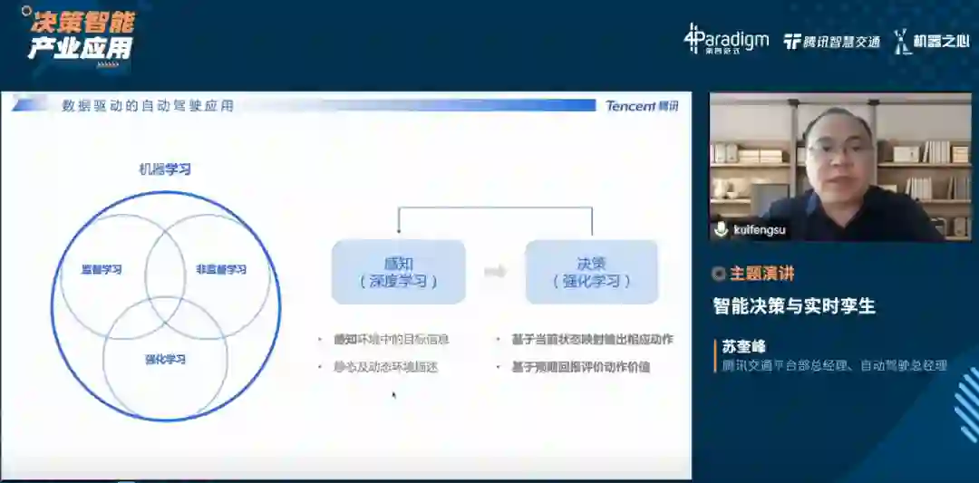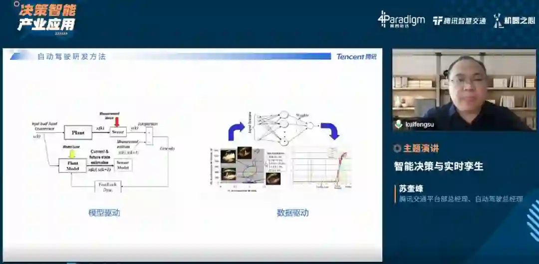 5 月 24 日,在机器之心举办的「决策智能产业应用」在线圆桌论坛上,腾讯交通平台部总经理、腾讯自动驾驶总经理苏奎峰发表了主题演讲《实时孪生与智能决策》。