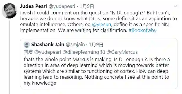 在另一条故事线上,深度学习三驾马车之一的 Yoshua Bengio 和「一直以来的深度学习黑粉」 Gary Marcus 的年度拌嘴留下了一个经典问题:「深度学习是否已经足够了?」("Is DL enough?")这也再次引出了「深度学习到底是什么」的讨论。2011 年图灵奖得主、贝叶斯网络之父 Judea Pearl 就表示「因为深度学习没有清晰的定义,所以我没办法回答深度学习是不是已经足够了」。