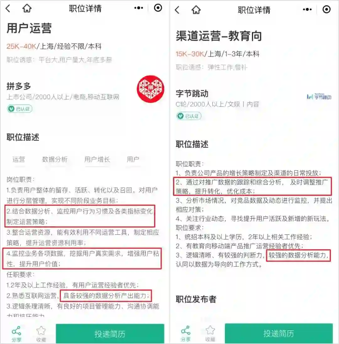 从企业的招聘需求中也可以看出来,不论是做产品、运营还是市场,如果是想要进大厂,数据分析能力就更是标配了。