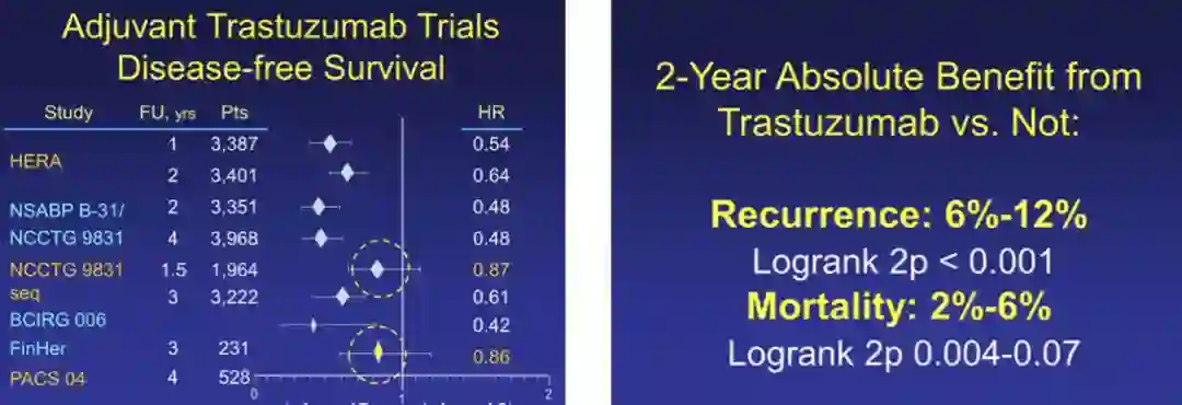 1990年,第一个靶向HER2的人源化单克隆抗体----曲妥珠单抗问世,开启了乳腺癌生物靶向治疗的新时代。正如其商品名赫赛汀(Herceptin)所融合的HER2、拦截(intercept)和抑制剂(inhibitor)三重含义,曲妥珠单抗充满了机遇与挑战。1995年,H0684g研究入组了469例未经治疗的HER2阳性转移性乳腺癌,随机接受标准化疗或化疗联合曲妥珠单抗治疗,中位随访30个月结果表明,联合曲妥珠单抗组ORR提高18%,死亡风险降低20%,总生存期延长5个月。基于该结果,1998年,FDA批准曲妥珠单抗用于HER2阳性转移性乳腺癌治疗。NSABP-B31、NCCTG 9831、HERA、BCIRG006四项前瞻性研究入组超过13000例HER2阳性早期乳腺癌,比较单纯化疗与化疗联合靶向治疗对预后的影响,结果表明一年曲妥珠单抗辅助治疗显著降低复发和死亡风险,奠定了曲妥珠单抗在HER2阳性早期乳腺癌辅助治疗的基石地位。