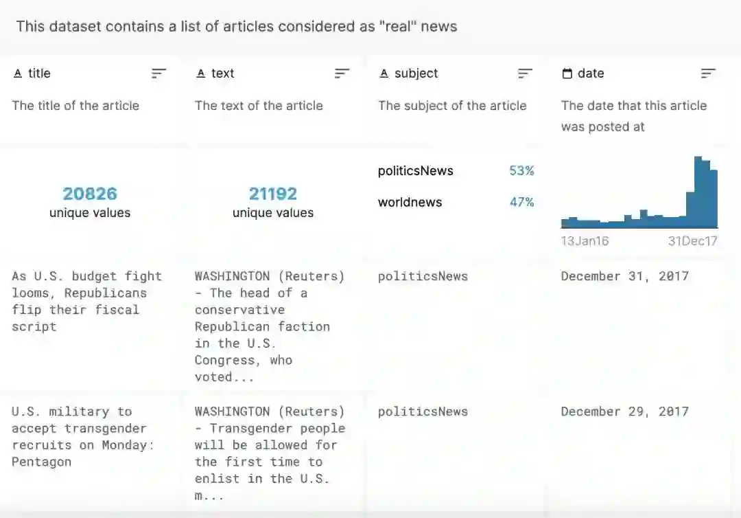 本数据集汇总了2015年-2018年间的一些真实的新闻和虚假的新闻,包含每篇新闻的主题类型、标题、正文和日期。