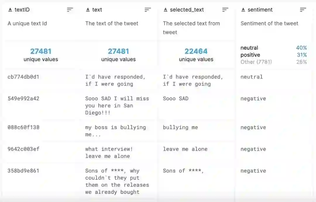 每行包含一条推文的文本和一个情绪标签。在训练集中,您将获得一个从推文 (selected_text) 中提取的单词或短语,它封装了所提供的情绪。
