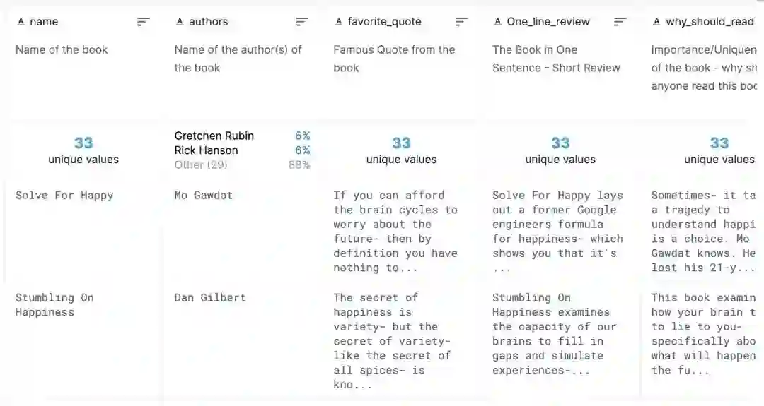 自 2005 年以来,整体幸福感正在下降,而悲伤和愤怒等负面情绪却在上升。更糟糕的是,越来越多的年轻人患有精神疾病、成瘾及其后果。本数据集收集了排名前33名的关于幸福的书籍、评论和引用。