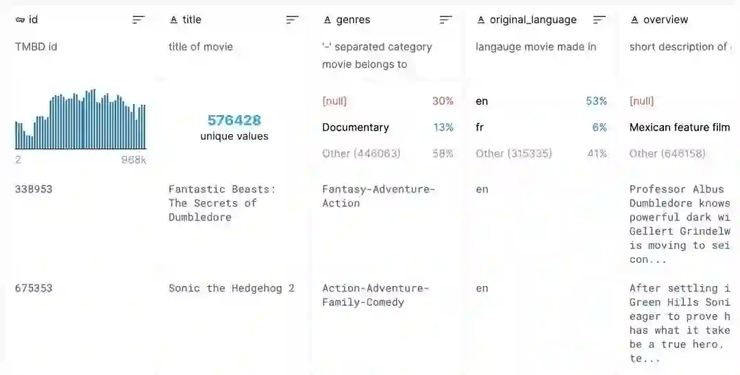 这些文件包含 TMDB 数据集中列出的超过 700,000 部电影的元数据。数据集每天更新以确保更新电影数据集。数据点包括演员、工作人员、情节关键词、预算、收入、海报、发布日期、语言、制作公司、国家、TMDB 投票计数和投票平均值、评论、推荐。