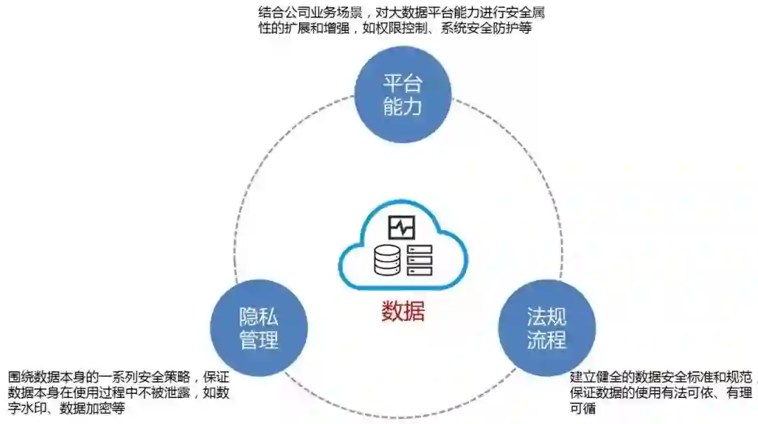 以终为始,我们在构建数据安全体系的指导原则就是,明确“让数据更加安全的被使用”的目标,打造以“数据”为中心,结合“平台能力”、“隐私管理”、“法规流程”三个要素,构建具有公司特色的数据安全体系,系统化解决数据安全问题,发挥数据的更大价值。
