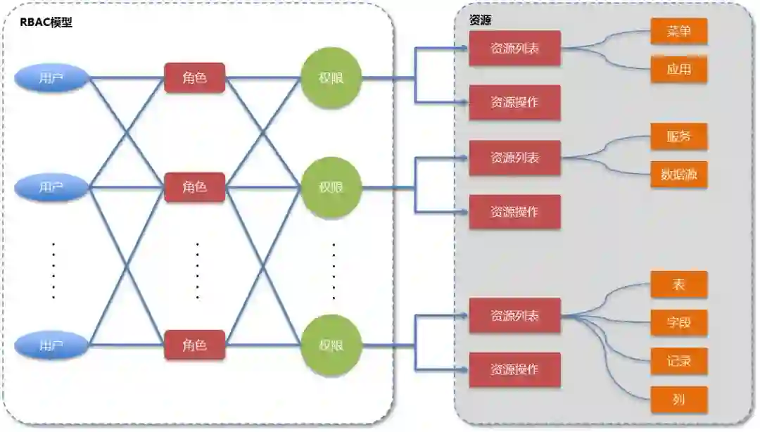 那么如何在现有权限模型的基础上进行扩展,以适配当前的业务场景呢?我们对权限做了扩展,将其定义为“资源+操作”一种组合,对于菜单、页面、按钮、表、字段、任务、拓扑等进行了泛化,统一定义为资源,既保证了数据鉴权流程的稳定,又灵活应对了由于数据类型繁多带来的不确定性。