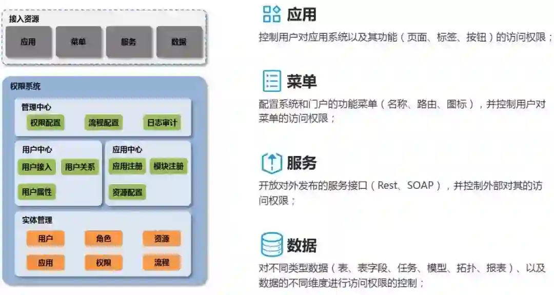 结合数据中心的职能定位和业务场景,将应用、菜单、服务、数据四个维度纳入权限系统管理,给权限系统赋予了新的定位-一站式权限管控中心。