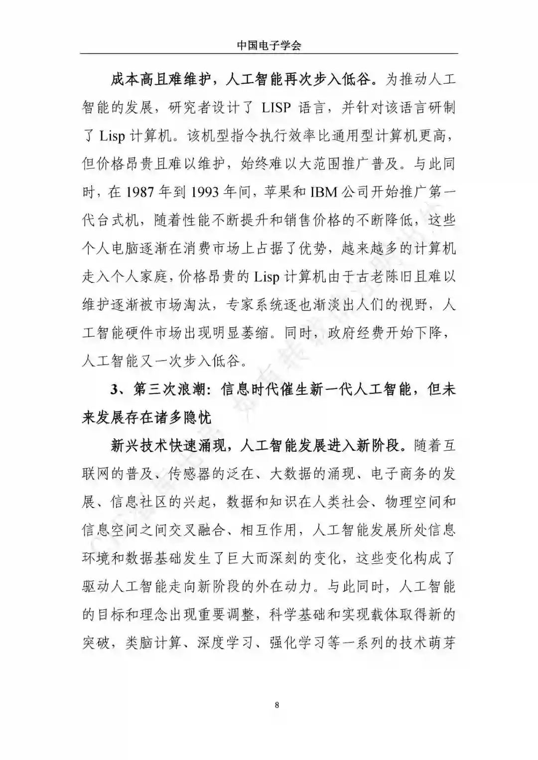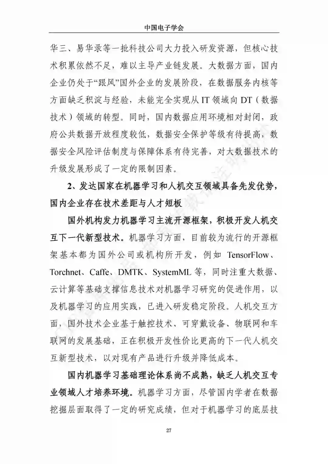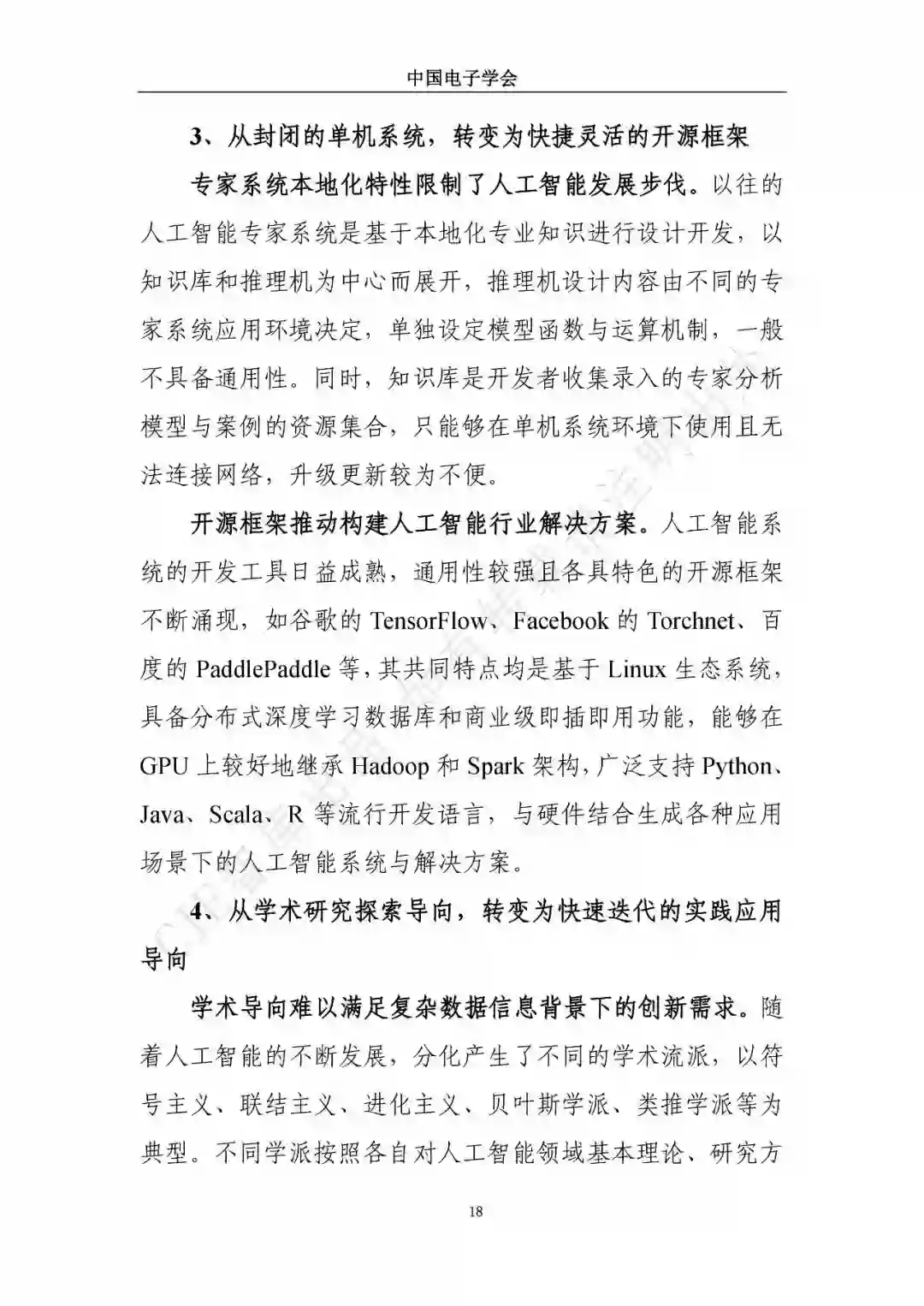 近日,中国电子学会/CIE智库发布了《新一代人工智能发展白皮书》。本白皮书重点围绕新一代人工智能面临的新形势、驱动的新因素、呈现的新特征,详细介绍了新一代人工智能发展特征、技术框架及产业化应用,展望了新一人工智能中长期技术及产业发展趋势,分析了人工智能领域的投融资特征及趋势,最后,提出了推动新一代人工智能发展的措施建议。