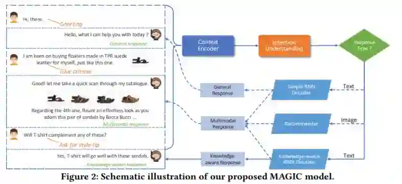 摘要:站在文本对话系统的肩膀上,多模态对话系统最近引起了越来越多的关注,尤其是在零售领域。尽管多模式对话系统具有商业价值,但它们仍面临以下挑战:1)以适当的媒体形式自动生成正确的回复;2)在选择产品图片时,共同考虑视觉提示和辅助信息;3)利用多方面的异构知识指导响应的产生。为了解决上述问题,我们提出了一种具有适应解码器的多模态对话系统,简称为MAGIC。尤其,MAGIC首先通过理解给定多模态上下文的意图来判断响应类型和相应的媒体形式。此后,它采用自适应解码器来生成所需的响应:简单的递归神经网络(RNN)用于生成一般响应,然后一种考虑知识的RNN解码器被用来编码多形式的领域知识以丰富响应,多模态响应解码器使用了一个神经图像推荐模型,该推荐模型同时考虑了文本属性和图像视觉信息,该模型是使用max-margin损失进行优化的。我们在基准数据集上通过对比验证了MAGIC的合理性。实验结果表明,MAGIC的性能优于现有方法,并达到了最先进的性能。