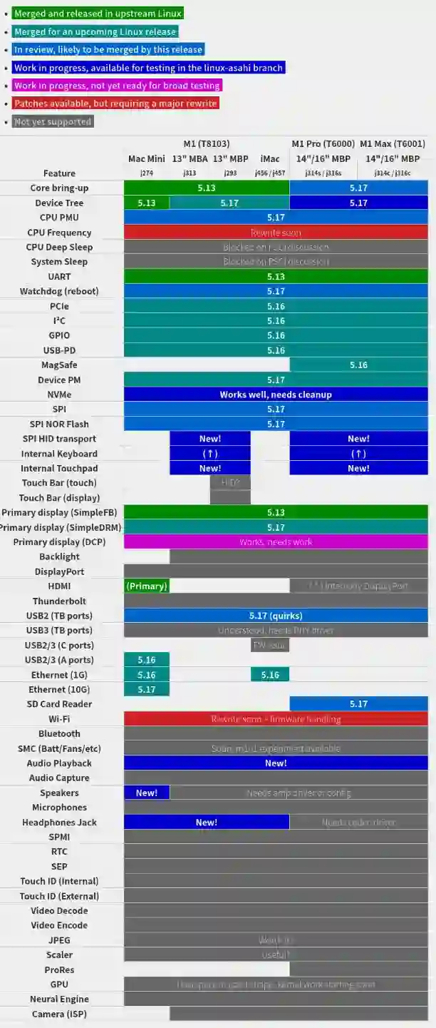 当前 Asahi Linux 项目对 Apple M1 SoC 不同组件的支持状态的概述