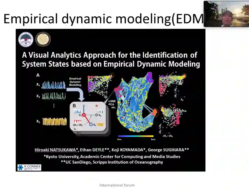 接着,Koyamada教授介绍了团队在Visualization-enhancedAI中的相关研究——基于神经网络的PDE求解过程的可视分析。含有偏微分方程的可解释性模型对于研究包括新冠疫情在内的新特性数据具有关键性作用。Koyamada教授团队将时空数据经过PINN模型(Physics Informed Neural Network)以及自动微分法后得到偏微分项,然后经过正则化回归方程计算其系数结果,将残差作为其损失函数,从而实现偏微分方程推导(PDE Derivation)。团队针对于PDE推导过程设计了一个可视分析系统,如图4所示。用户可在可视分析系统中对神经网络模型进行优化,该系统包括了对神经网络的时空、参数空间和损失函数的可视化。Koyamada教授也针对面向超参数空间的残差可视化在偏微分方程推导的应用进行了介绍以及案例分析。Koyamada教授还介绍了有关PDE求解(PDE Solution)的研究工作,即在给定初始和边界条件中,在损失函数中加入初始和边界条件的误差项从而实现PDE的处理,并提出了其可视分析需求,介绍了EDM相关研究,如图5所示。