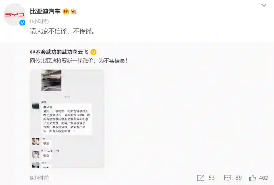 【又要涨价?比亚迪深夜回应】网传比亚迪将要新一轮涨价,比亚迪汽车销售有限公司副总经理李云飞回应:为不实消息。同时,比亚迪汽车官方微博也转发称,“请大家不信谣、不传谣。”(每日经济新闻)