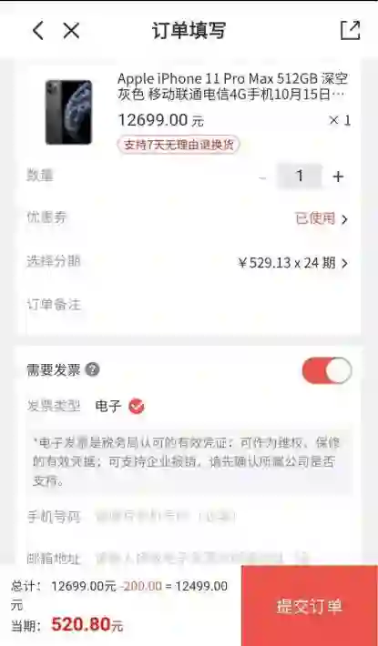 比如现在京东上,顶配 iPhone 11 Pro Max 最高可以分 24 期,但没有任何优惠,需要多支付 1521 元的利息费,明显不划算。苏宁暂时也没有分期优惠,同样要支付额外的费用。