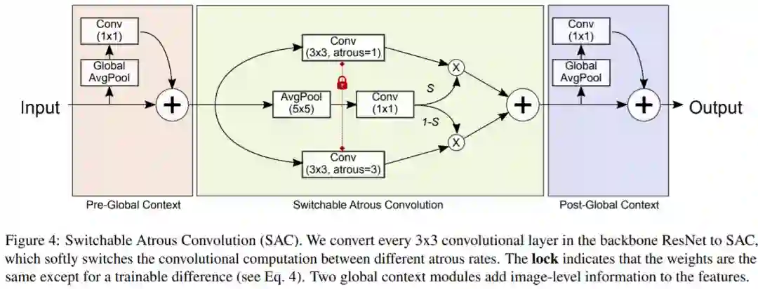 在微观层面上,作者提出了可切换的空洞卷积(SAC,Switchable Atrous Convolution),它以不同的atrous rate对特征进行卷积,并使用switch函数收集结果,具体如图1(b)所示。