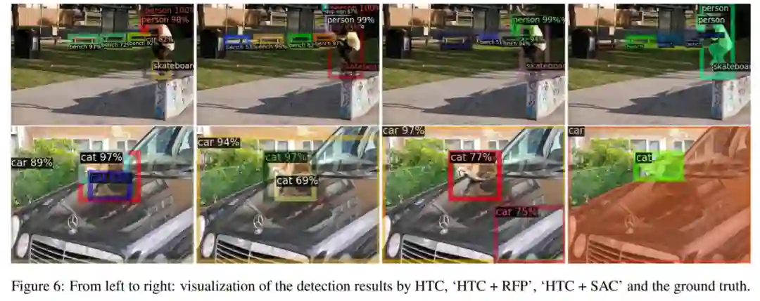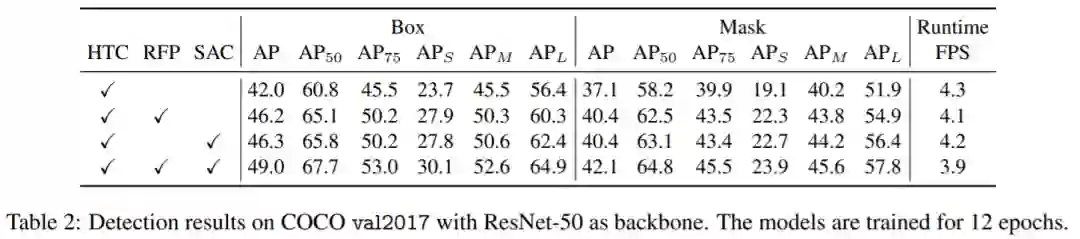 看一下,HTC(基于ResNet) + RFP + SAC 的涨点情况,直接从42.0 AP涨到49.0 AP