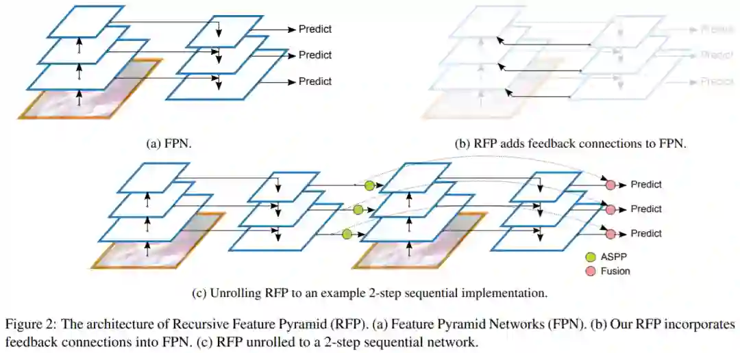 在宏观层面上,作者提出了递归特征金字塔(RFP,Recursive Feature Pyramid),它结合了从特征金字塔网络到自下而上的backbone层的额外反馈连接,具体如图1(a)所示。